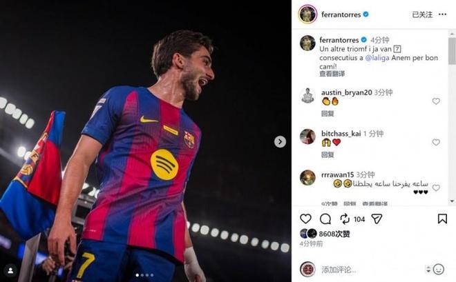 费兰・托雷斯在赛后通过社媒分享了喜悦:“又一场胜利!西甲 7 连胜,我们正走在正确的道路上!”